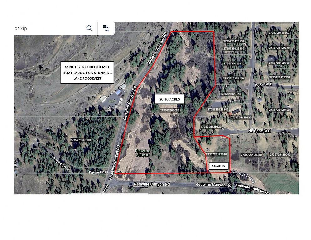 Roosevelt Lake Ranch Timbers Development 22 acres. 2 separate parcels; 1.86 acres lot situated at the end of the cul-de-sac and 20.10 acres of property behind that is treed, private and has a creek running through. Property is connected to the community water system and has power. Located just minutes to Lincoln Mill boat launch on stunning Lake Roosevelt. Come build your dream home and enjoy the lake.