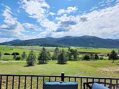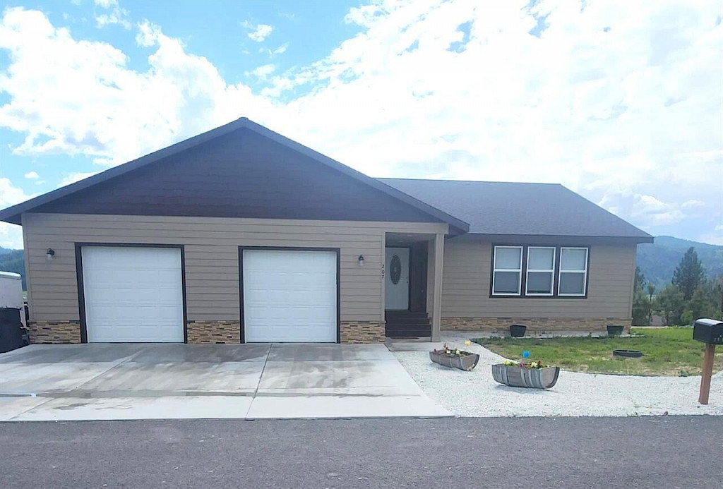 Built in 2022, this stunning home offers contemporary living paired with breathtaking mountain views, visible from the expansive back deck and numerous windows throughout the property. Nestled in the desirable Pinebrook Addition on nearly an acre, the 3-bedroom, 2-bathroom residence blends comfort, style, and efficiency. Notable features include a durable 20-year composite roof, fiber cement siding accented with stone trim and ridge shake details on the gables, and low-maintenance composite decking. Energy efficiency is prioritized with an inverter heat pump and vinyl windows that maximize natural light and insulation. The chef's kitchen is equipped with sleek stainless-steel appliances, including a double oven and beautiful granite countertops. Inside, soaring cathedral ceilings with